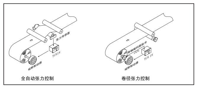 KTC83全自動與卷徑張力控制器8可以設(shè)置為全自動張力控制器或卷徑張力控制器,當(dāng)功能選擇[28] m設(shè)置允自動張力控制時(shí),KTC838為全自動張力控制器,需安裝張力傳感器組成閉壞控制系統(tǒng)。當(dāng)功能選擇[28]設(shè)置為卷徑張力控制時(shí),KTC838為卷徑張力控制器,只需安裝接近開關(guān)/編碼器對料卷半徑進(jìn)行測S,控制器根據(jù)卷徑進(jìn)行張力控制。