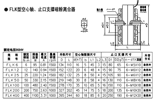 FLK型空心軸止口支撐磁粉離合器使用DC24V直流電壓,扭矩包括:6N.m 12N.m 25N.m 50 N.m 100 N.m 200N.m 400N.m。 FLK型空心軸支撐磁粉離合器原國標(biāo)型號有四種:FL10K、FL25K、FL50K、FL100K,晨港機電在此基礎(chǔ)上進行了豐富,型號更多,應(yīng)用更廣泛。